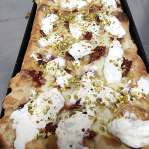 Mozzarella, pomodori secchi, stracciatella, granella di pistacchi