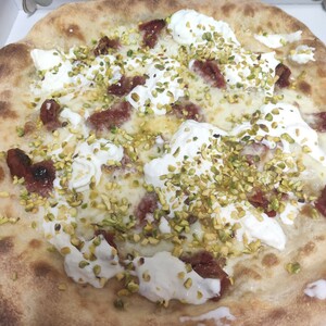 Mozzarella, pomodori secchi, all’uscita viene aggiunta stracciatella e granella di pistacchi