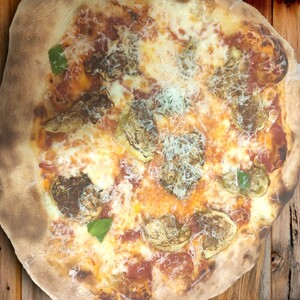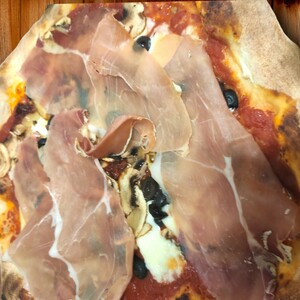 Pomodoro, mozzarella, champignon, olive, prosciutto crudo, carciofini