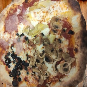 Pomodoro, mozzarella, champignon, carciofini, prosciutto cotto, olive